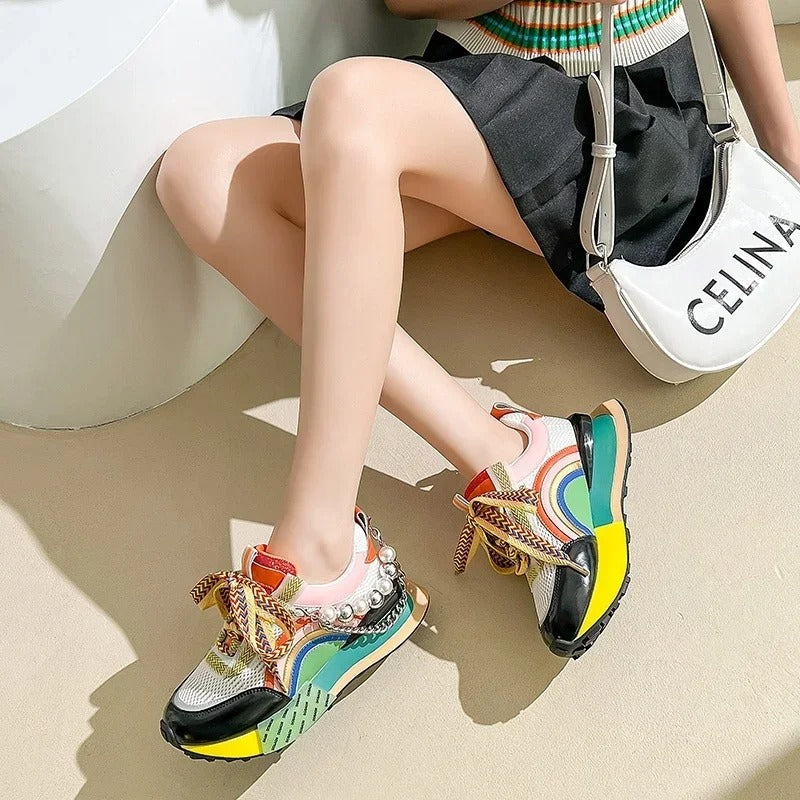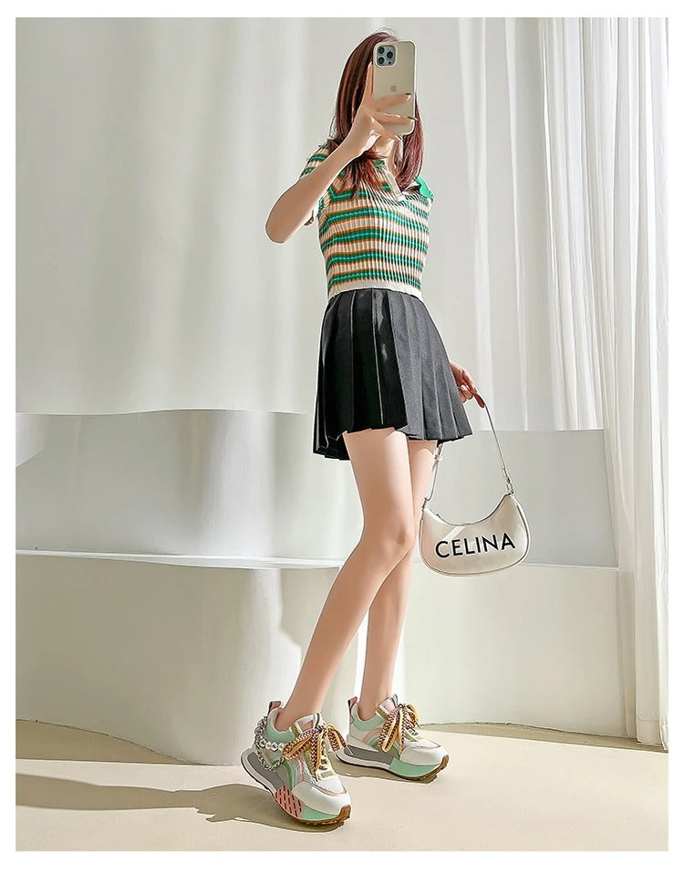 Adorned with delicate pearls, each step becomes a statement of elegance, ensuring you stand out with grace. Designed for all-day wear, these sneakers feature a cushioned insole and breathable materials for unparalleled comfort.